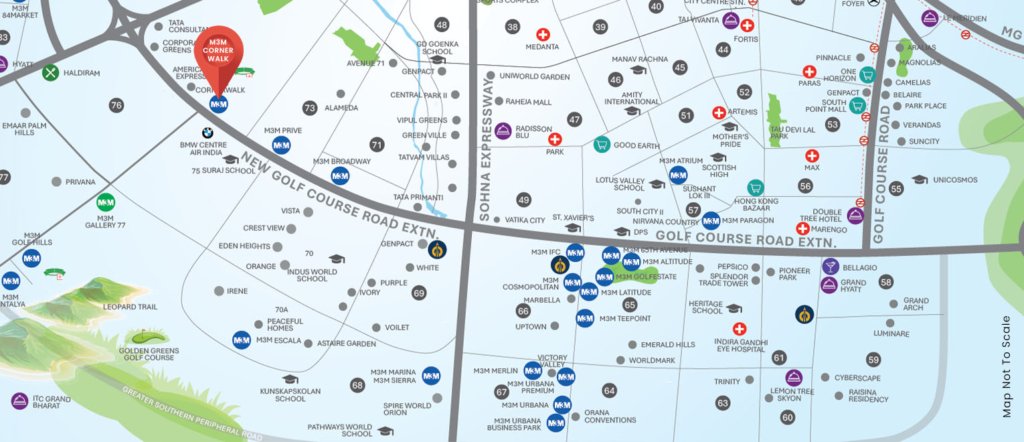 M3M Corner Walk Gurgaon is located in Sector 74 on Southern Peripheral Road, offering excellent connectivity to Golf Course Extension Road, Sohna Road, and NH-48.