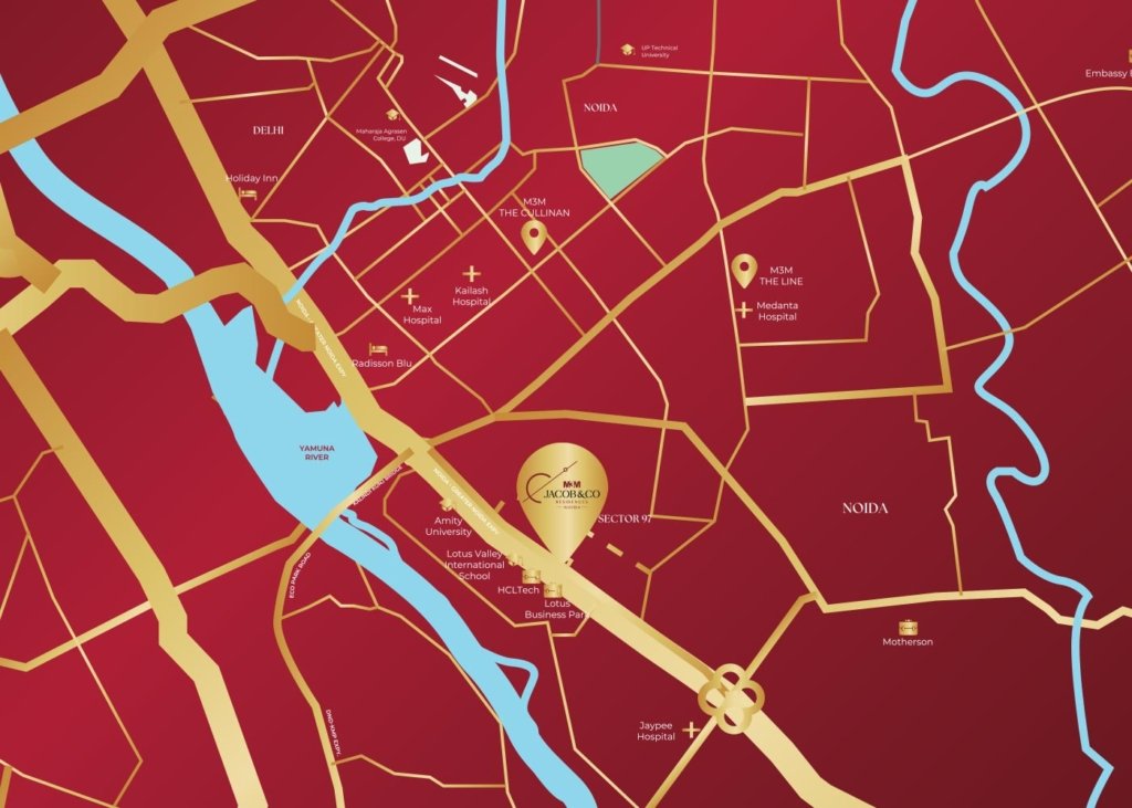The M3M Jacob & Co Residences Location Map shows proximity to expressways, commercial hubs, and premium social infrastructure, reinforcing the strategic value of M3M Jacob & Co Residences Noida.